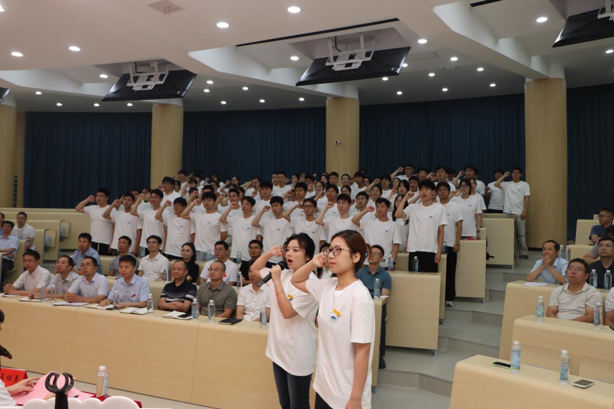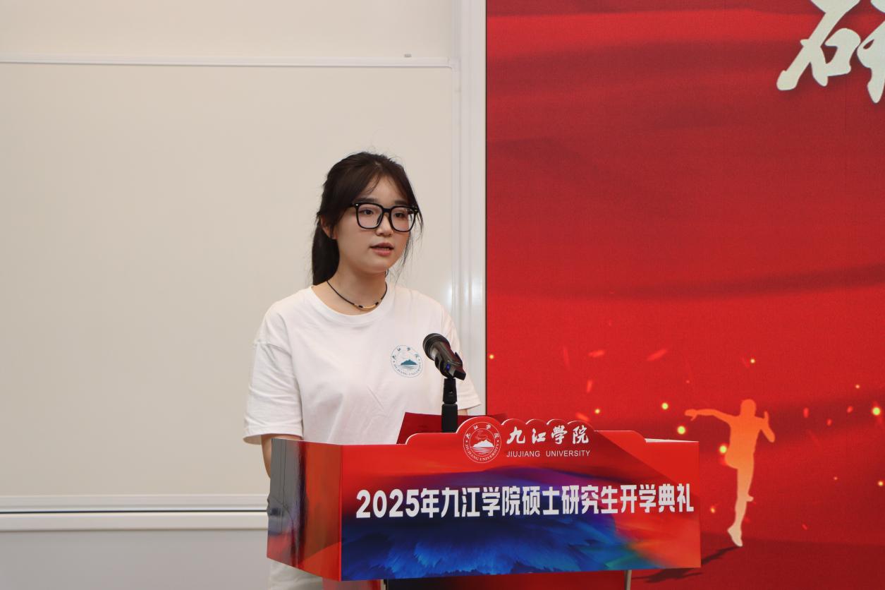 致辞结束后,校领导与发展规划与研究生处负责人为新生代表佩戴校牌。全体研究生起立,庄严宣誓,承诺恪守“竞知向学、厚德笃行”的校训,潜心钻研、勇担使命,以青春与智慧践行新时代九江学院人的责任与担当。